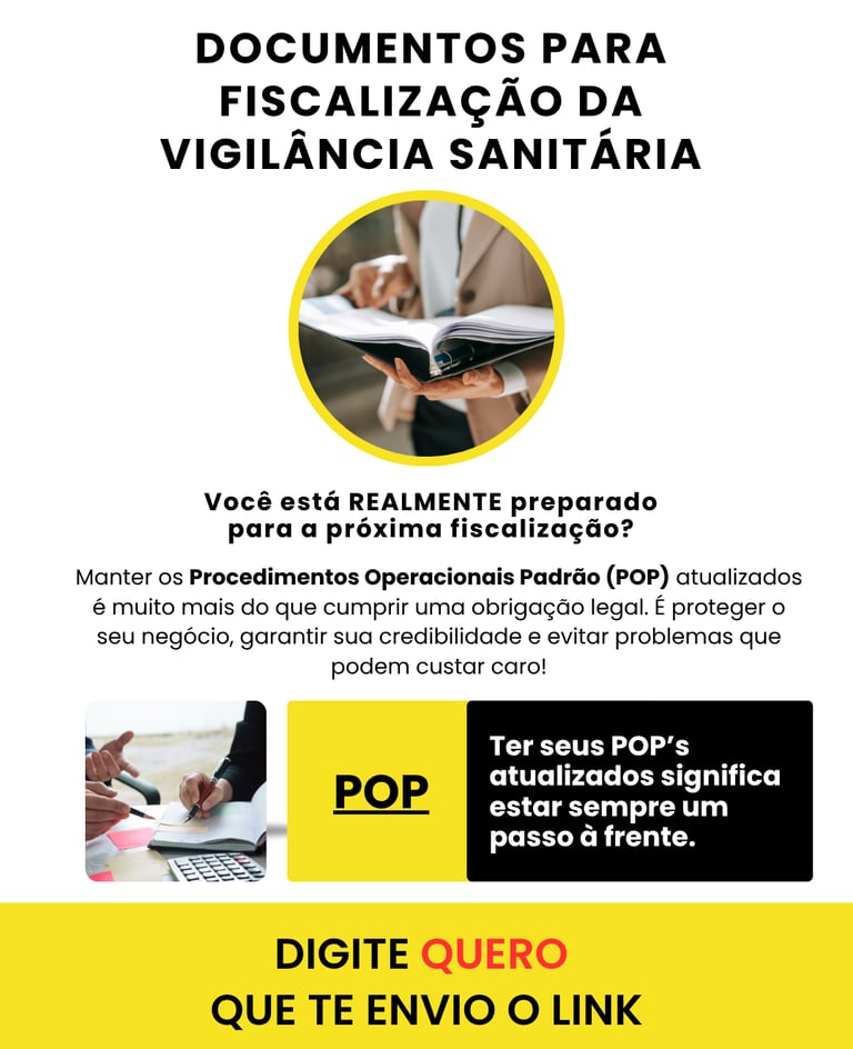 • Este material vai facilitar sua vida em relação a fiscalização sanitária. Aqui você encontrará os POPs necessários para o funcionamento do seu serviço dentro da conformidade. Tudo editável!!